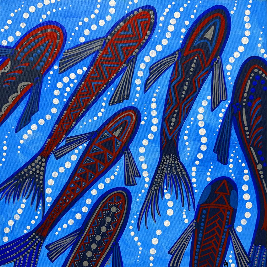 Our shared Exhibition with the Armidale and Region Aboriginal Cultural Centre and with the Yarrawarra Aboriginal Cultural Centre continues. There are beautiful works on display and available for purchase. Featured Image is by Jeremy Saunders – Mayipuyu (Mullet) – Acrylic on canvas